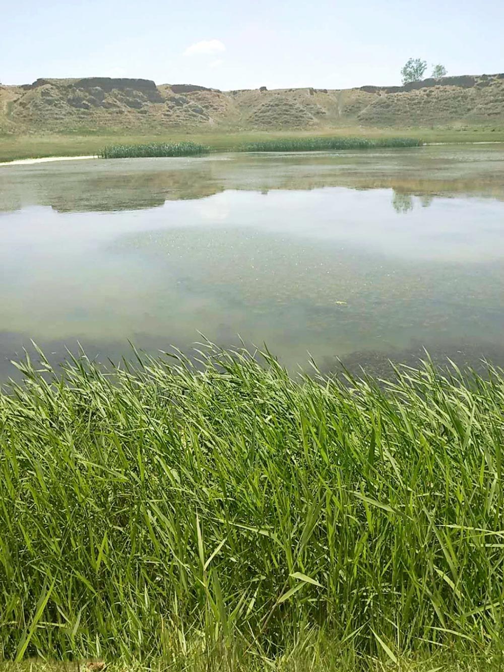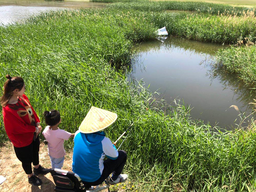 到達目的地后,看到藍(lán)天白云下的小土山和小池塘別有一番風(fēng)味。碧綠的草地,清澈的魚塘,我們仿佛走進了一幅自然畫卷,暢游在美景中不愿走出。