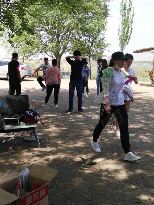 在石桌上鋪上臺(tái)布,支上烤架,把前一天串好的羊肉串拿出來,就可以開烤了。主烤人是趙宇,第一輪烤好后,分給大家吃,外焦里嫩,鮮美可口。苗總在另一桌湊了四個(gè)人打撲克,另一邊,大家圍成一個(gè)圈,一起踢毽子,還有人打羽毛球,跳大繩。這邊歡聲笑語,吃喝玩樂,那邊安謐寂靜,待魚上鉤,張總和另外兩個(gè)男生在不遠(yuǎn)處的湖邊釣魚,共釣上四條小魚,雖然不多,但釣魚享受的是過程。大家都吃的差不多了,就一起玩摸瞎的游戲。大家圍成一個(gè)圈,由一人在中間蒙上眼睛抓人。